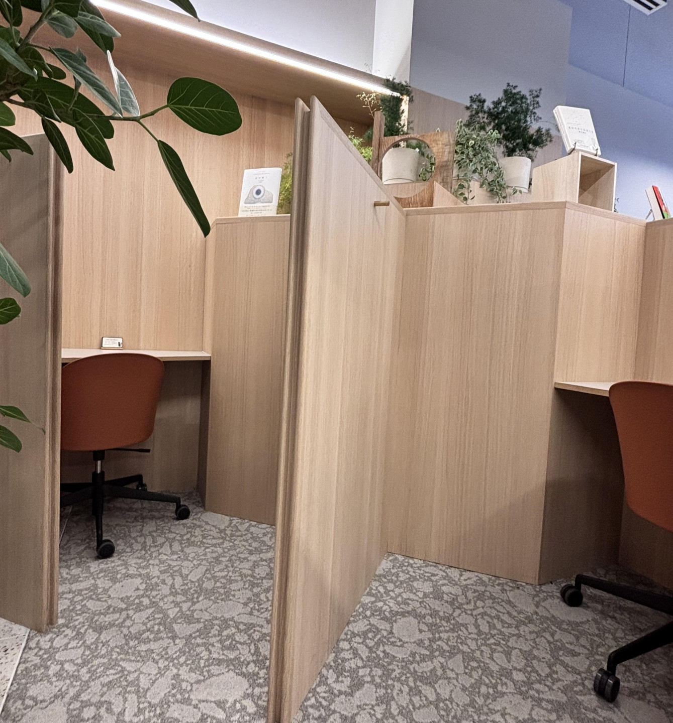 グレーとナチュラルウッドの色合いがお洒落な2人席。友達やパートナーと横並びで座って勉強することができる。