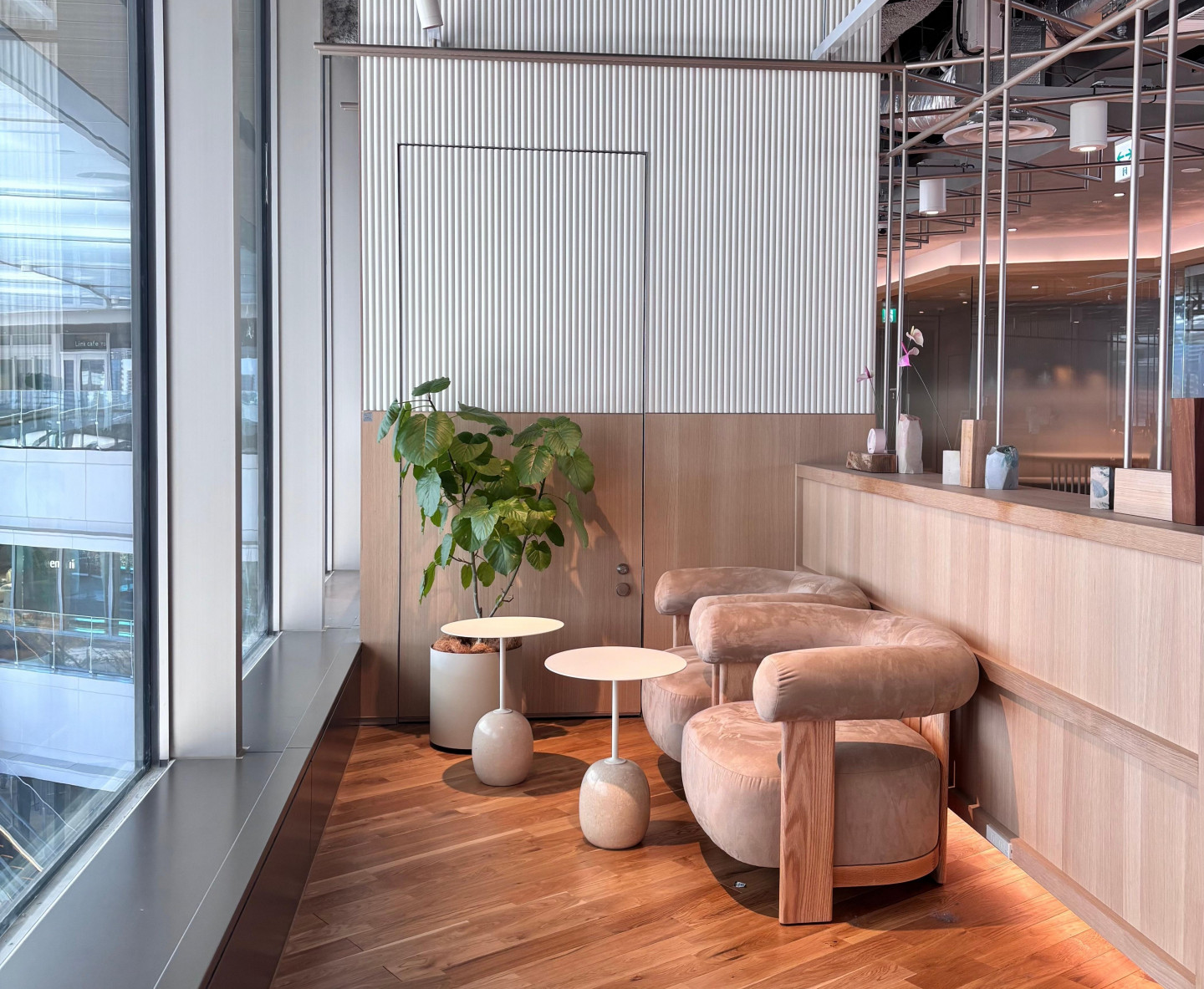 活気ある「Cafe ensemble」を抜け、店内奥へ。そこに広がるのは、JR「高輪ゲートウェイ駅」を一望できる「Panorama Lounge」。集中モードから一度離れ、遠くの景色を眺めながら思考をゆったりと広げるのにふさわしいスペースだ。