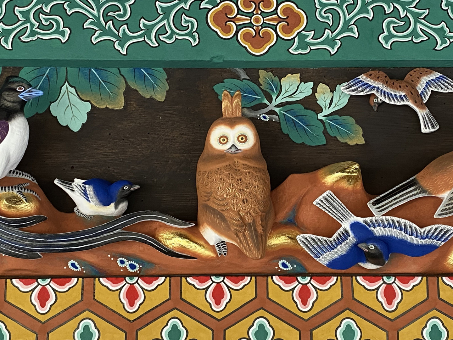 梟もさることながら、本殿には東西南北に多彩な彫刻が施され、それぞれにご利益があるとされる。