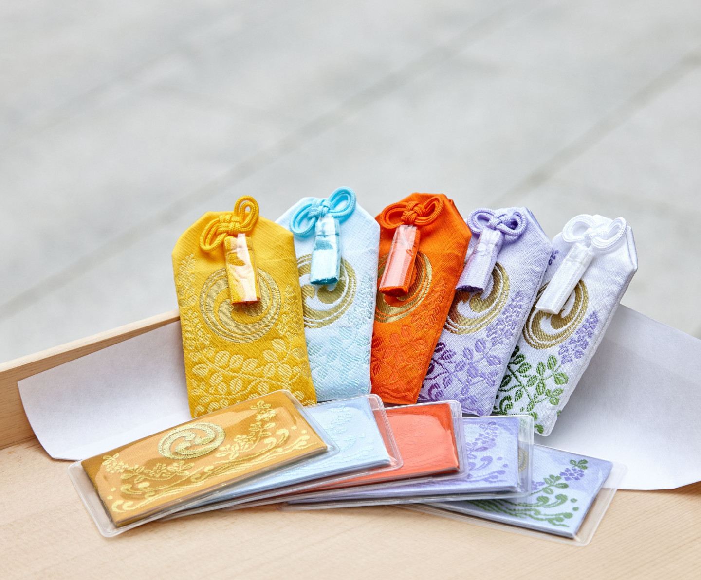 単なる色違いではなく、色ごとに異なる願いが込められており、黄色は金運向上や職業繁栄、水色は成績向上や芸道上達、赤色は家庭円満や人間関係の改善、紫色は長寿や健康回復、白色は開運招福や就職成就などのご利益が込められている。