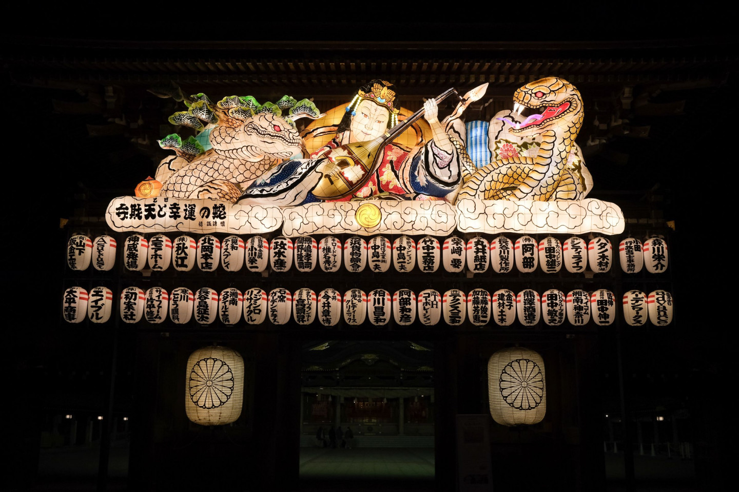 2001年に始まり、いまや寒川神社の冬の風物詩ともいわれる「迎春ねぶた」。新年の厄災を払い、平和で幸多き1年になるようにとの願いを込め、例年、年末から2月下旬頃まで神門に設置される。