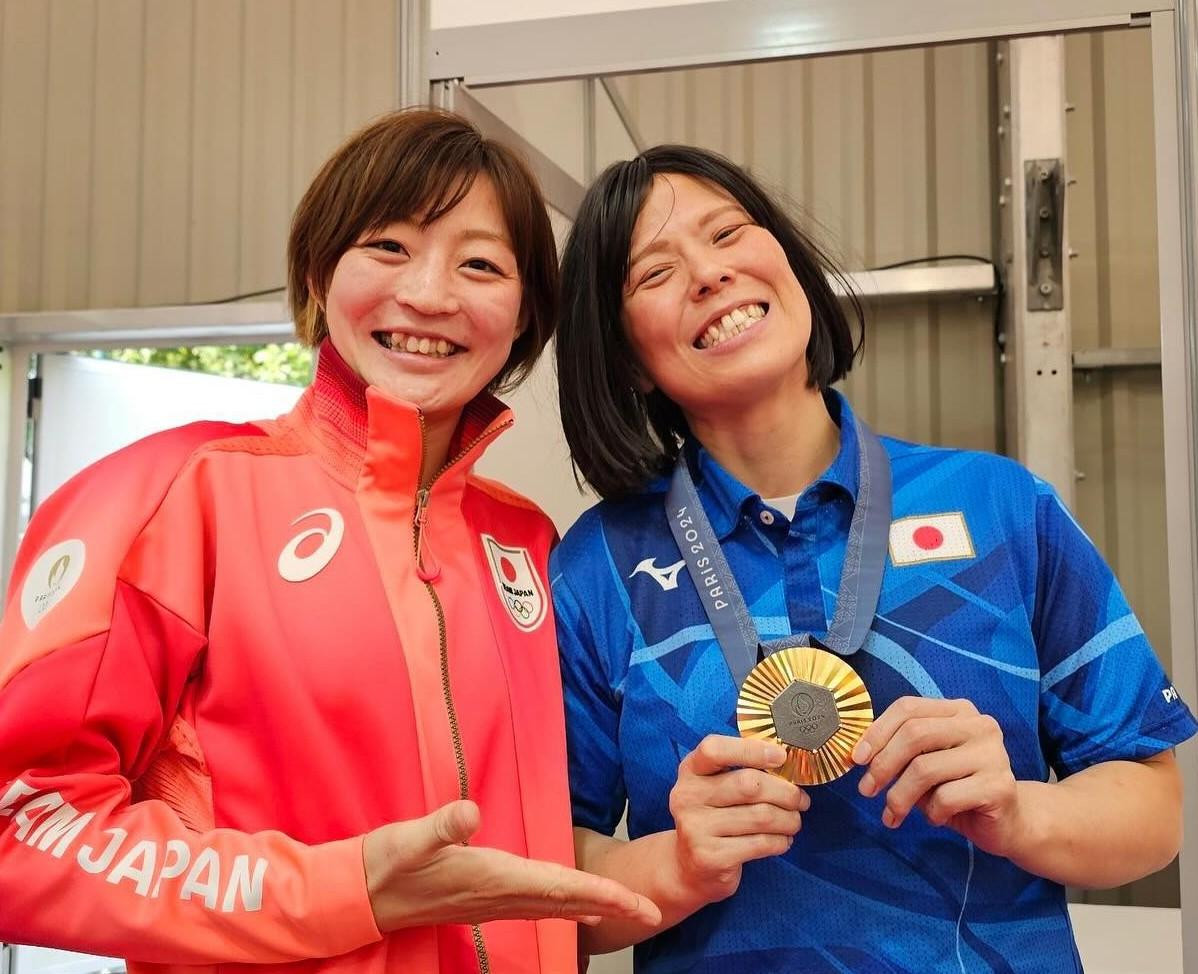 パリ五輪柔道女子48kg級で掴んだ金メダルを、当時のコーチ、今井 優子さん(右)の首にかけ、共に笑顔を見せる角田選手。