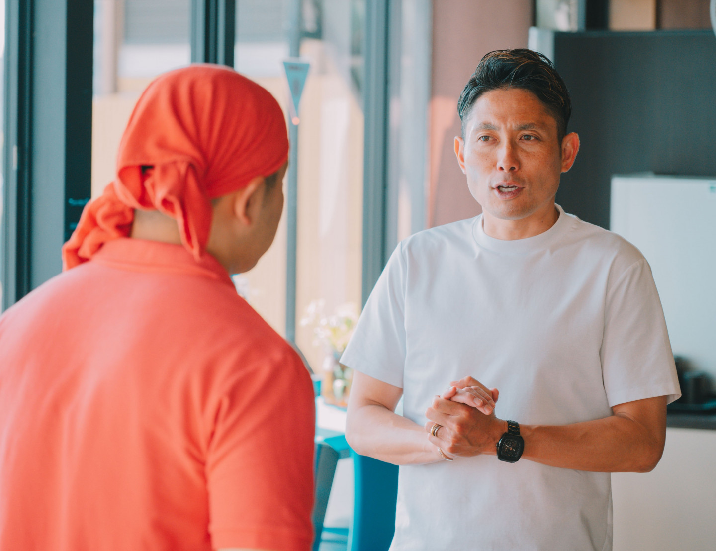 森脇 良太(以下、森脇) 実は、沖縄のサウナ施設で、うちわをバッサバッサと仰いでる人を見たことがあるんですよ。でもそのときは「この人、めっちゃ頑張ってるなぁ」くらいにしか思ってなくて(笑)。まさかそれが“熱波師”だったなんて!