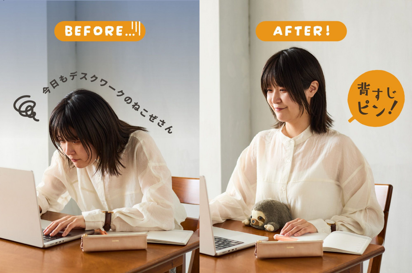 そこで頼もしい味方になってくれるのが、見た目は愛らしいぬいぐるみ&中身は実力派の姿勢サポートぬいぐるみ「ふんばるず」。机とお腹の間にそっと挟むことで、自然と背筋を意識させてくれるユニークなアイテムです。