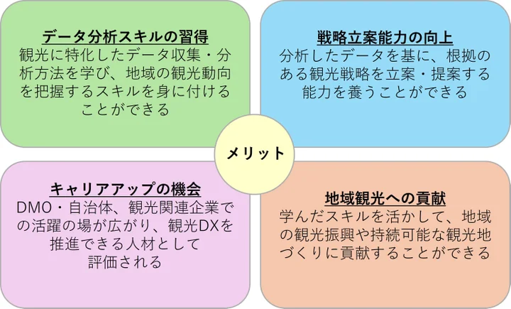 試験を通じて、観光分野におけるデータ分析やDX(デジタルトランスフォーメーション)の基礎知識を身につけることができる。