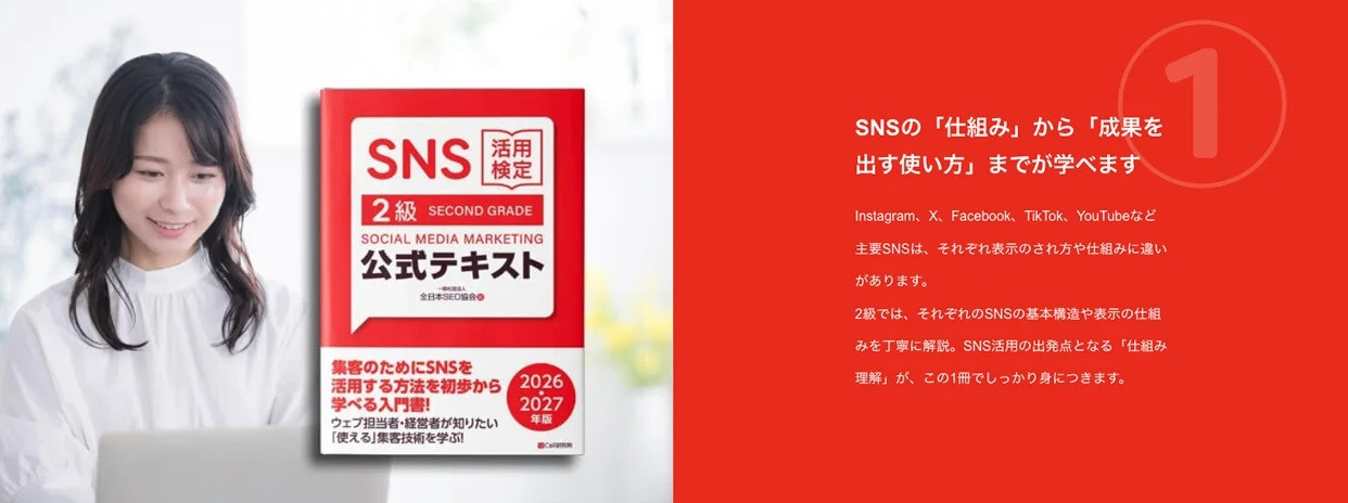 資格を取ること自体が目的ではなく、テキストを読み、試験に取り組むことで、独学でも企業が求めるSNS活用技術を身に付けられる点が特徴です。